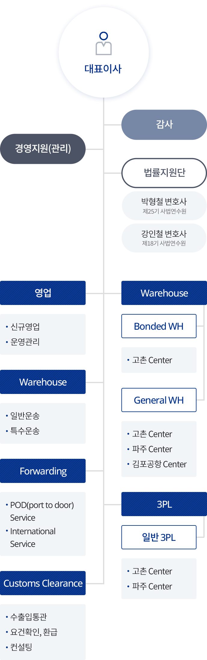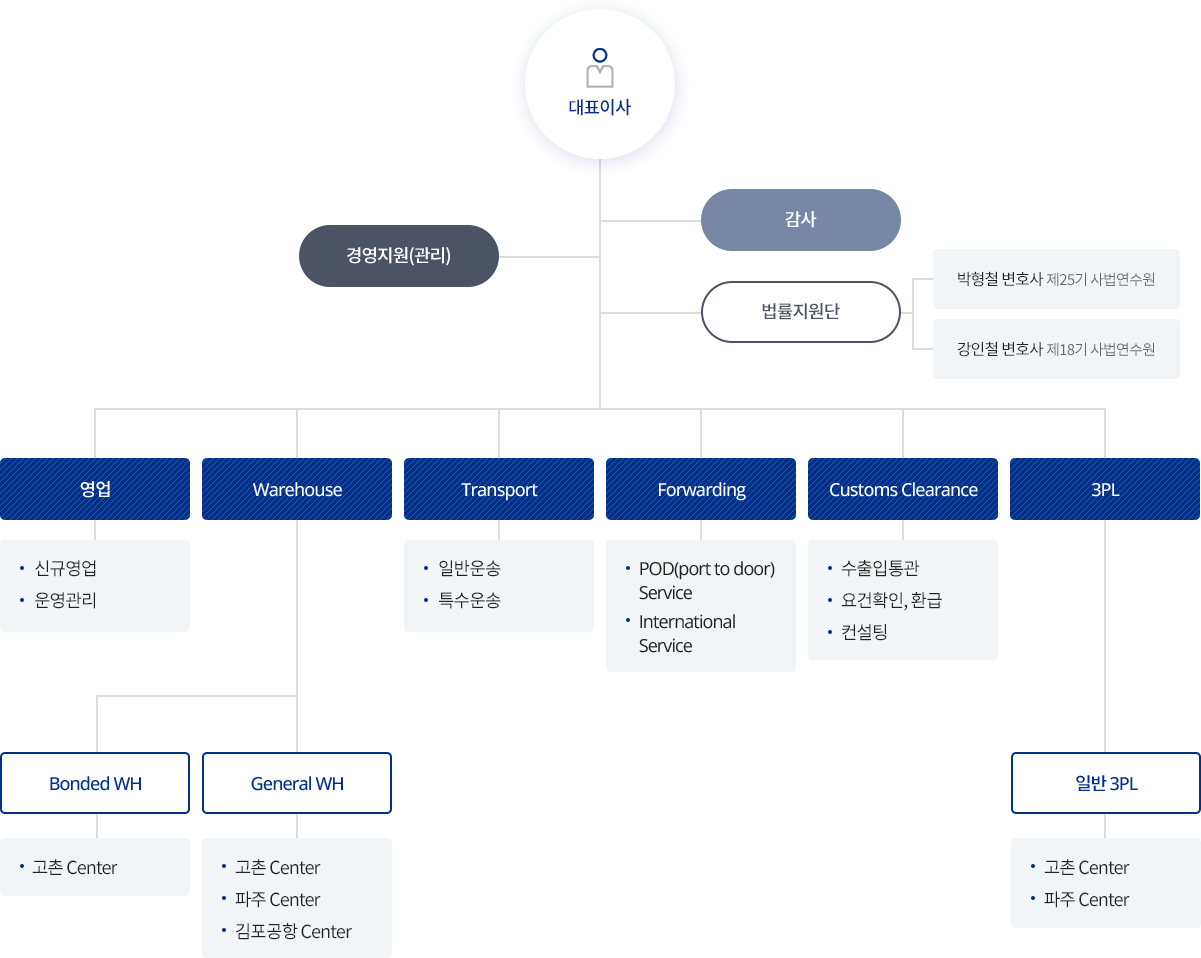 | 창고 | 운송 | 국제물류 | 영업부 | 관리부 | 통관(해도) |